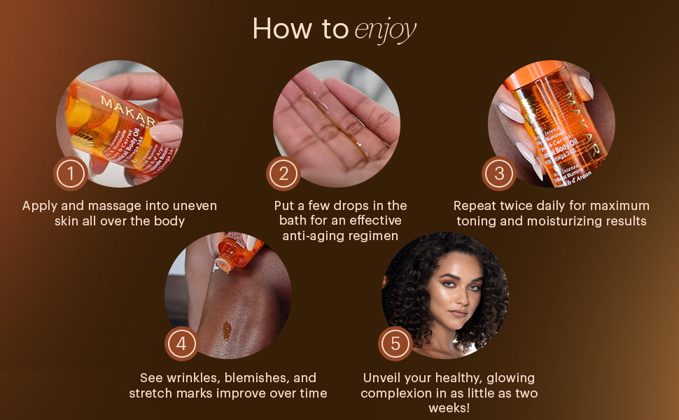 For best results, apply to damp skin after a shower or bath. Massage in upward circular motions until fully absorbed to lock in moisture and boost radiance. For an elevated skincare ritual, follow with Makari’s 24K Rose Gold Beauty Milk.